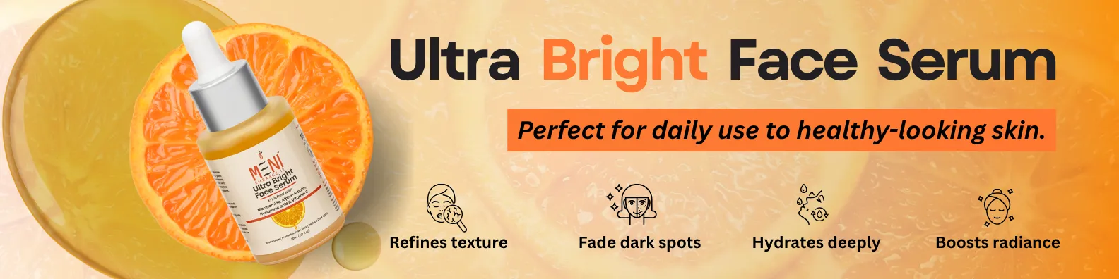 If you’re looking to achieve a visibly brighter, even-toned, and youthful glow — MENI’s Ultra Bright Face Serum is your perfect skincare essential. Powered by a synergy of modern actives and natural botanicals, it hydrates, brightens, and protects your skin, revealing a naturally radiant complexion.