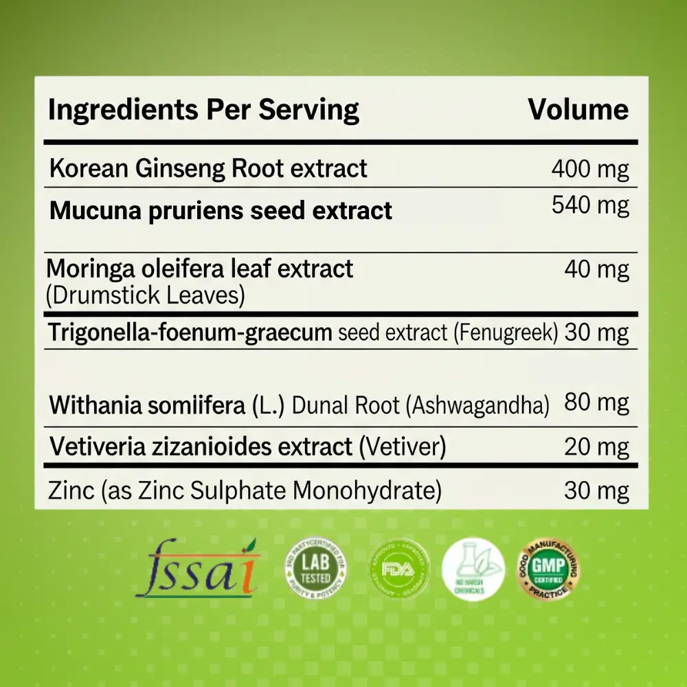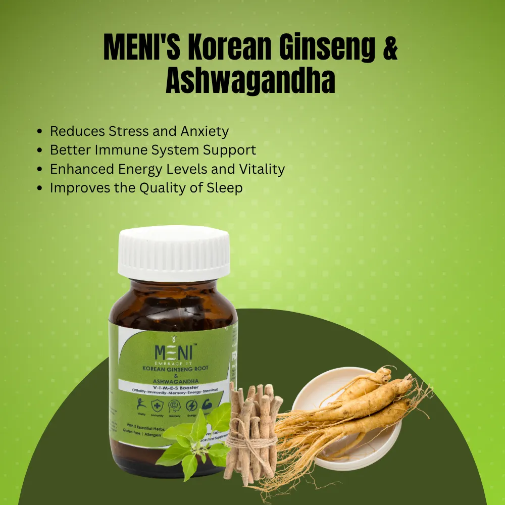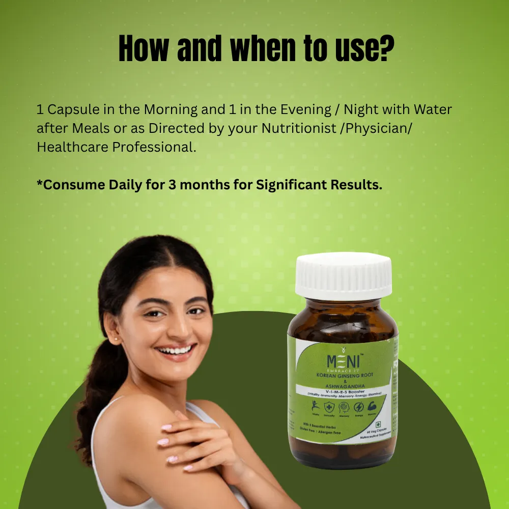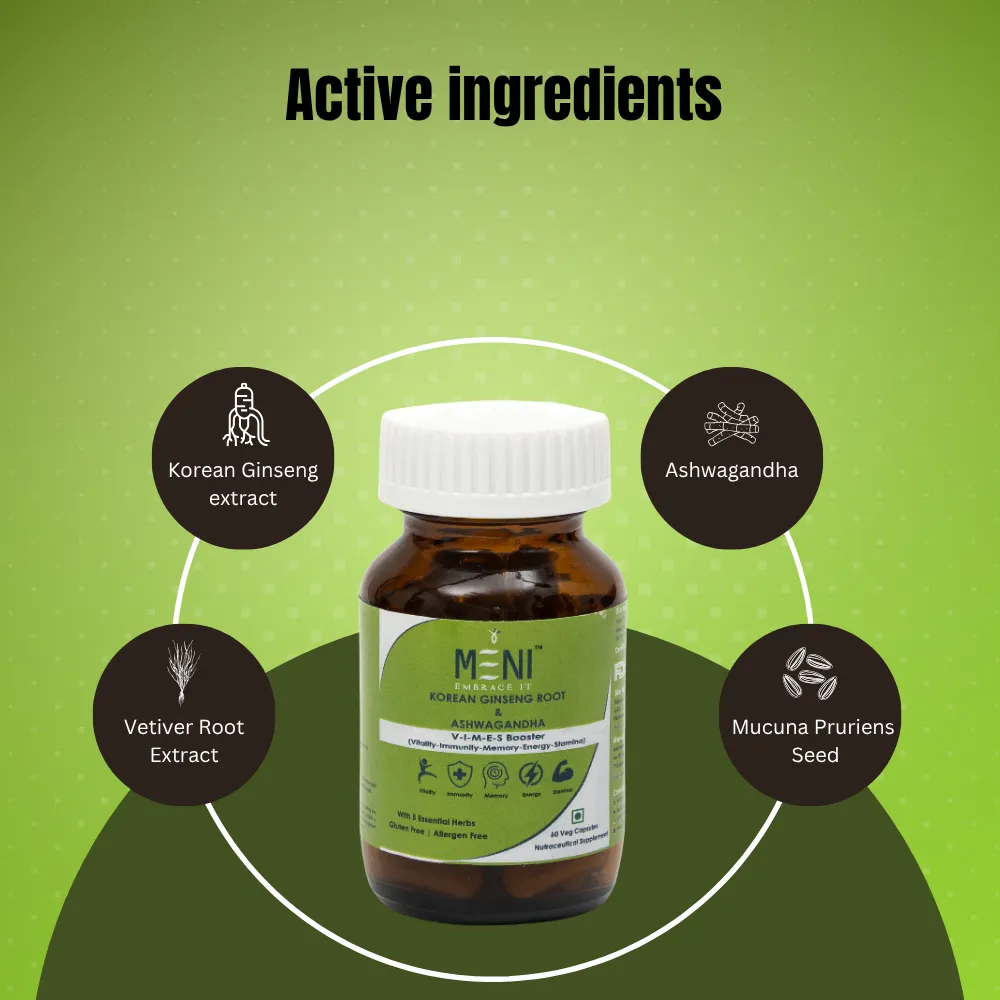 MENI Korean Ginseng Root Extract Capsules for Boosts Immunity | Enhances Strength & Stamina | Support Stress Management | Enriched with Ashwagandha, Vetiver root extract, Fenugreek, Mucuna Pruriens Seed | Supplements for Men and Women | 60 Energy veg capsules.