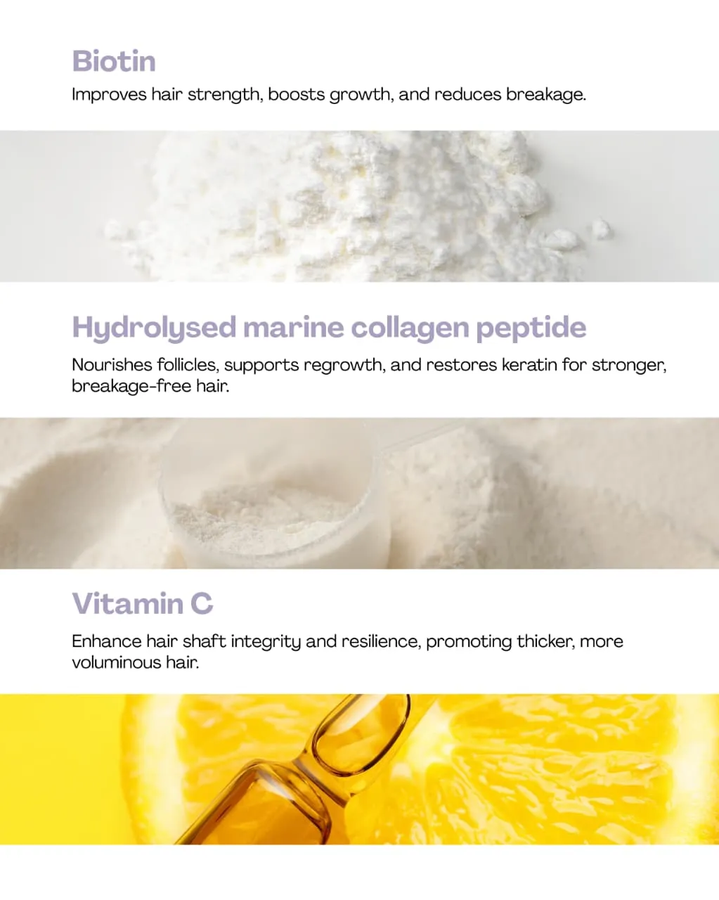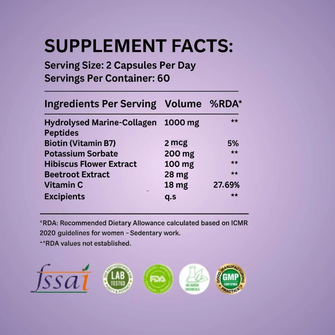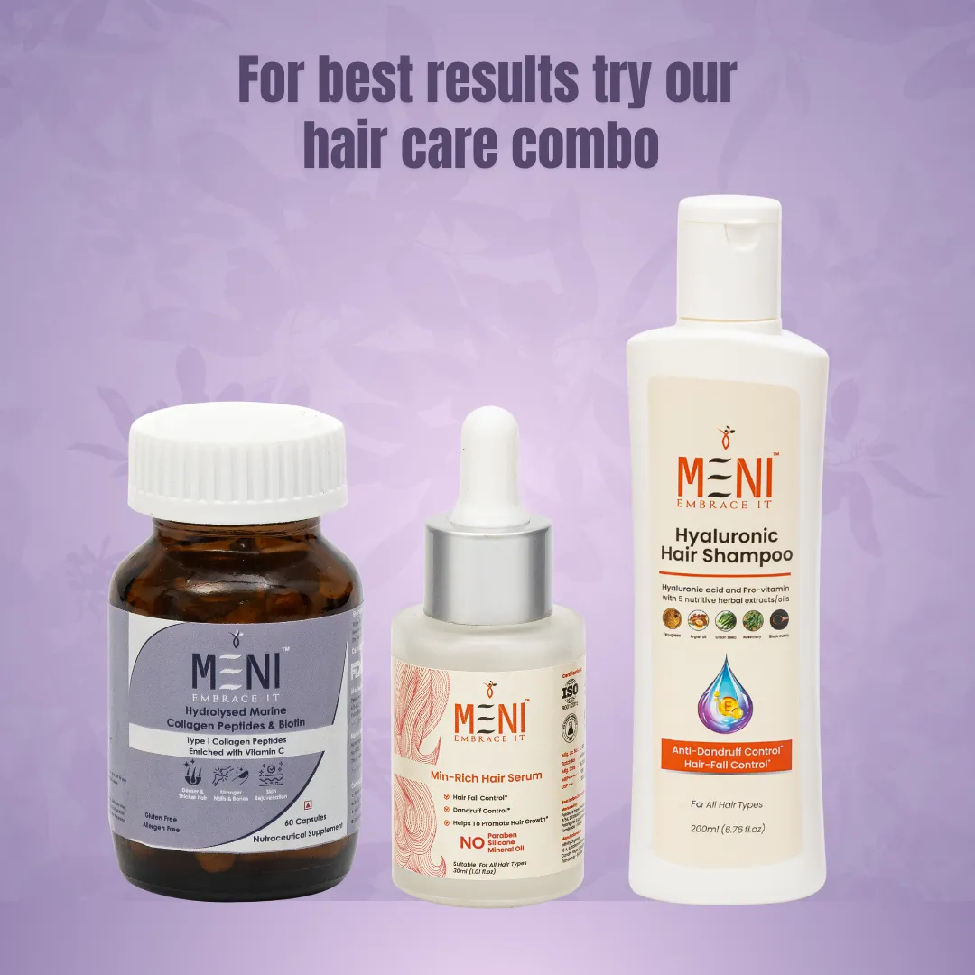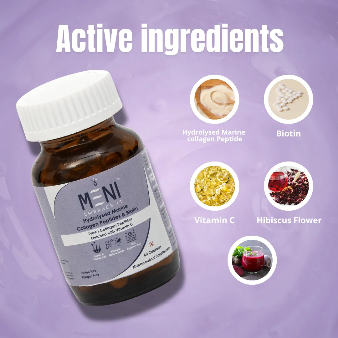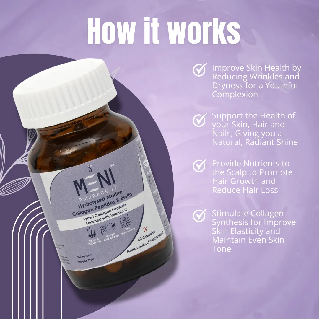 MENI's Hydrolysed Marine Collagen Peptides & Biotin | Hair Fall Reduction| Hair Regrowth | Strengthen Hair Follicles | Enriched with Biotin (Vitamin B7), Vitamin C, Hibiscus flower, Beetroot | Supplements for Men and Women | 60 Collagen capsules.
