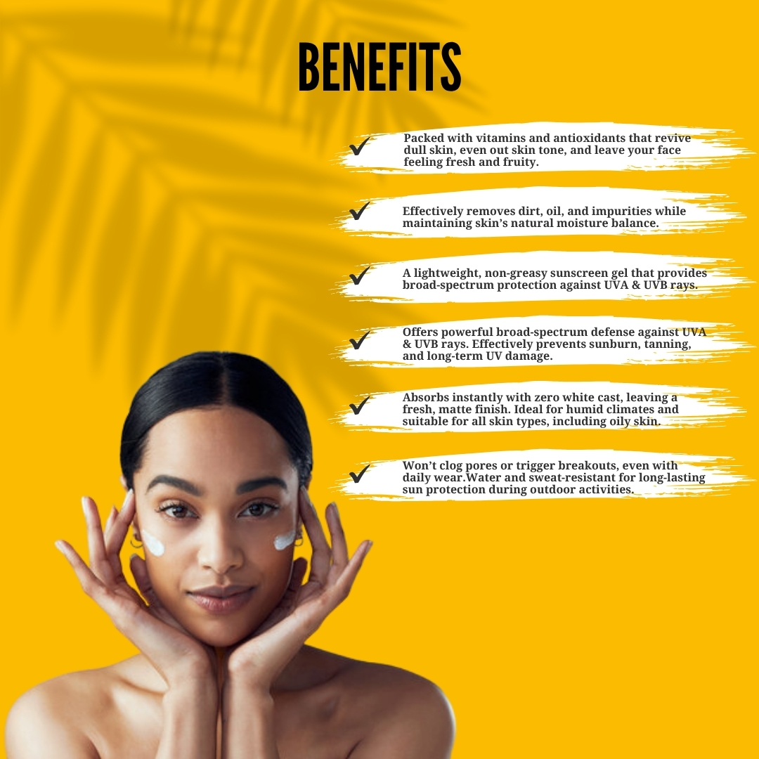 Gentle Cleansing, Deep Hydration, and a Fruity Fresh Glow and SPF 50+ | Broad Spectrum UVA/UVB | Blue light protect | Shielding the skin from sun damage | For Women & Men